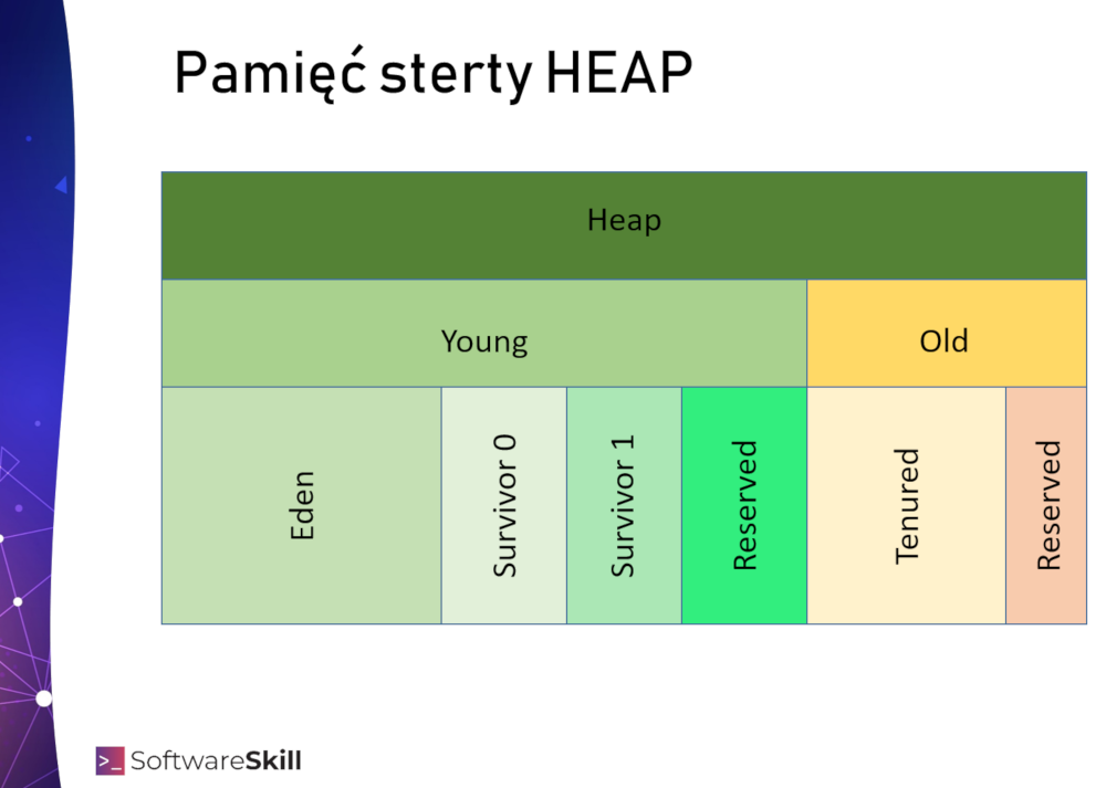 Pamięć sterty jest głównym przedmiotem zainteresowania programistów. W tym miejscu żyją wszystkie stworzone przez nas obiekty. Na wydajność naszej aplikacji największy wpływ ma sposób wykorzystania pamięci sterty. Poniższa fotografia prezentuje strukturę pamięci heap.